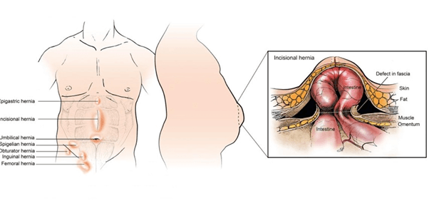 hernias happen in the groin area and are called inguinal or femoral hernias. Incisional hernias are from a